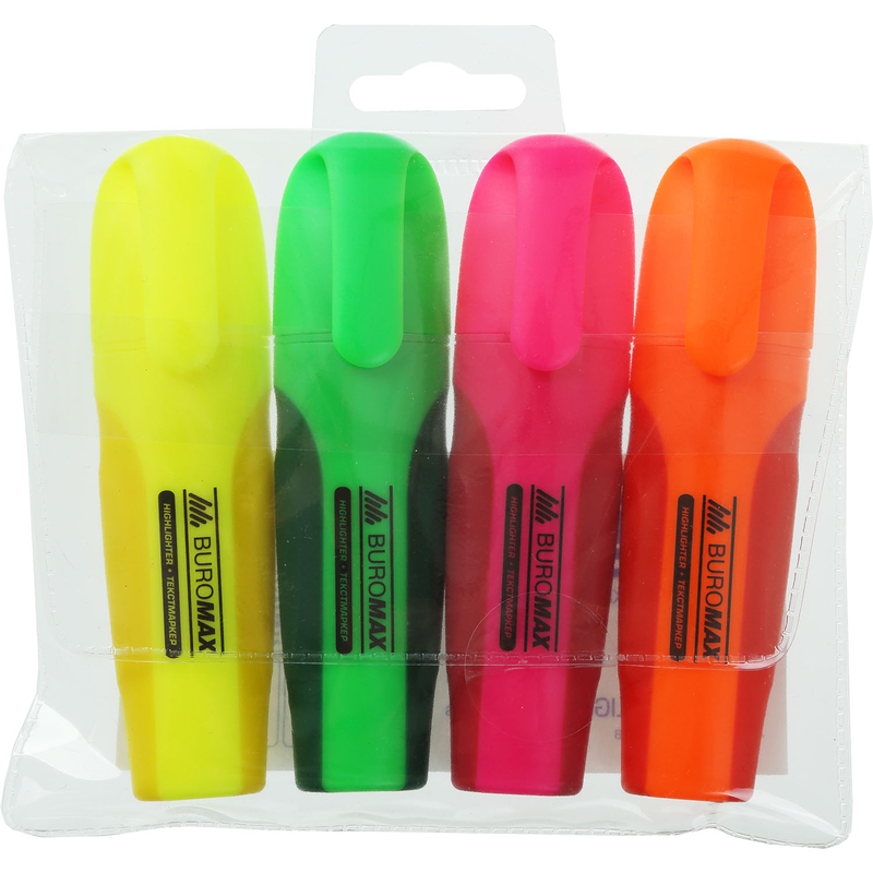 Високоякісне чорнило текстових маркерів BUROMAX спеціально розроблене для зручного та легкого виділення тексту на різних видах паперу. За допомогою тестових маркерів BM. 8904 можна швидко виділити як рукописний текст на папері різної товщини, так і на факсовому папері, а також текст, надрукований за допомогою будь-яких різновидів принтерів і за допомогою копіювальних апаратів.Чорнила маркерів BM.8904 не розмазують текст, що виділяється, залишають слід, що дозволяє прочитати виділений текст під кольоровим шаром маркера. Чорнило не просочується навіть через тонкі сорти паперу.Зносостійкий пишучий вузол з гладким пористим клиноподібним наконечником забезпечує насичену і чітку лінію листа товщиною від 2 до 4 мм, яка може змінюватись в залежності від нахилу маркера. Написи легко та плавно лягають на папір, що робить процес використання маркера BUROMAX максимально комфортним. Зручності використання також сприяють гумові вставки, розміщені з обох боків корпусу.Вузол і наконечник, що пише, витримують високі показники тиску і натиску без втрати функціональних властивостей. Корпус з первинного PP (поліпропілену) не пропускає повітря до стрижня, не допускає його швидке висихання та забезпечує можливість тривалого зберігання та використання маркера. Завдяки чорнилу на водній основі сліди від маркера легко змиваються практично з усіх видів тканин, а також різних поверхонь. Важливою перевагою текстових маркерів BUROMAX є те, що вони не засихають без ковпачка до 5 днів.Відсутність хімічного запаху разом із безпечною водною основою робить процес використання текстового маркера BUROMAX комфортним та придатним для навчання, професійних та побутових потреб.Набір текстових маркерів BM.8906-94 містить маркери жовтого, зеленого, рожевого та помаранчевого кольорів. Упаковка: PVC-пенал з європідвісом.