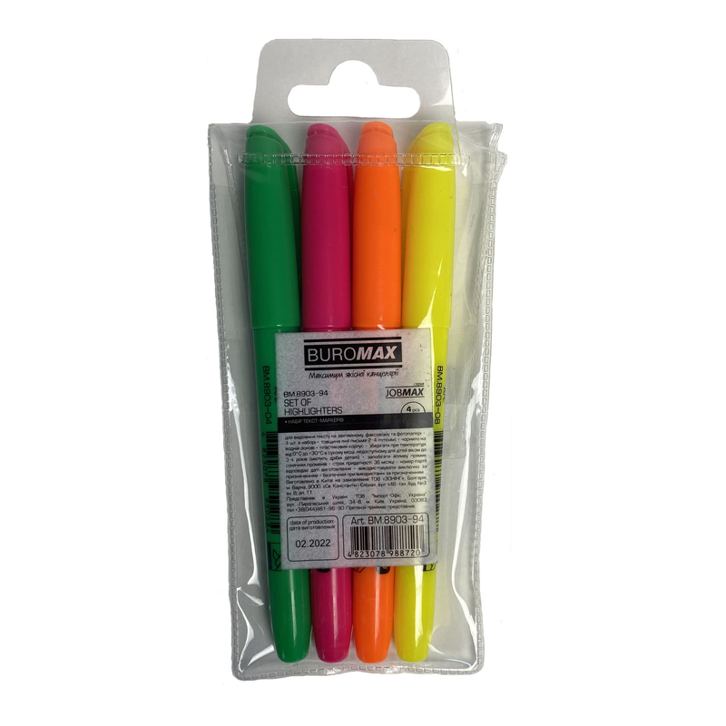 Опис Набір з 4х текст-маркерів (жовт., помар., рож, зел.), JOBMAX, 2-4 мм, круглі Набір (Im-off) код товару BM.8903-94