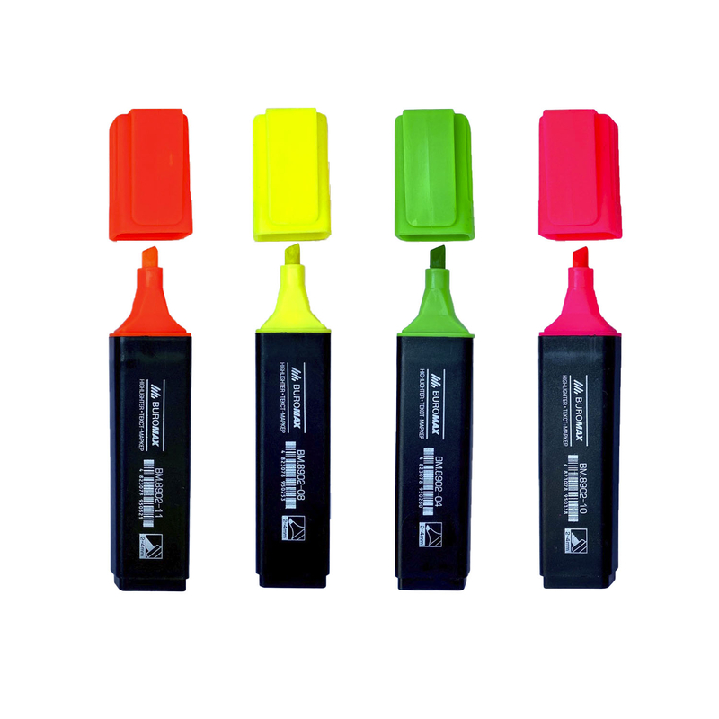 Високоякісне чорнило текстових маркерів BUROMAX спеціально розроблене для зручного та легкого виділення тексту на різних видах паперу. За допомогою тестових маркерів BM. 8904 можна швидко виділити як рукописний текст на папері різної товщини, так і на факсовому папері, а також текст, надрукований за допомогою будь-яких різновидів принтерів і за допомогою копіювальних апаратів.Чорнила маркерів BM.8904 не розмазують текст, що виділяється, залишають слід, що дозволяє прочитати виділений текст під кольоровим шаром маркера. Чорнило не просочується навіть через тонкі сорти паперу.Зносостійкий пишучий вузол з гладким пористим клиноподібним наконечником забезпечує насичену і чітку лінію листа товщиною від 2 до 4 мм, яка може змінюватись в залежності від нахилу маркера. Написи легко та плавно лягають на папір, що робить процес використання маркера BUROMAX максимально комфортним.Вузол і наконечник, що пише, витримують високі показники тиску і натиску без втрати функціональних властивостей. Корпус з первинного PP (поліпропілену) не пропускає повітря до стрижня, не допускає його швидке висихання та забезпечує можливість тривалого зберігання та використання маркера. Завдяки чорнилу на водній основі сліди від маркера легко змиваються практично з усіх видів тканин, а також різних поверхонь. Відсутність хімічного запаху разом із безпечною водною основою робить процес використання текстового маркера BUROMAX комфортним та придатним для навчання, професійних та побутових потреб.У набір BM.8902-93 входять маркери жовтого, салатового та оранжевого кольорів.Упаковка: PVC-пенал із європідвісом.