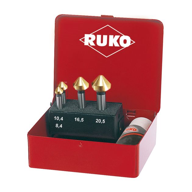 Характеристики Набір зенкеров 4 шт. HSS TiN, DIN 335, форма C 90° (10,4 - 16,5 - 20,5 - 25,0 мм) + смазочна паста RUKO (102150TR) код товару 102150TR