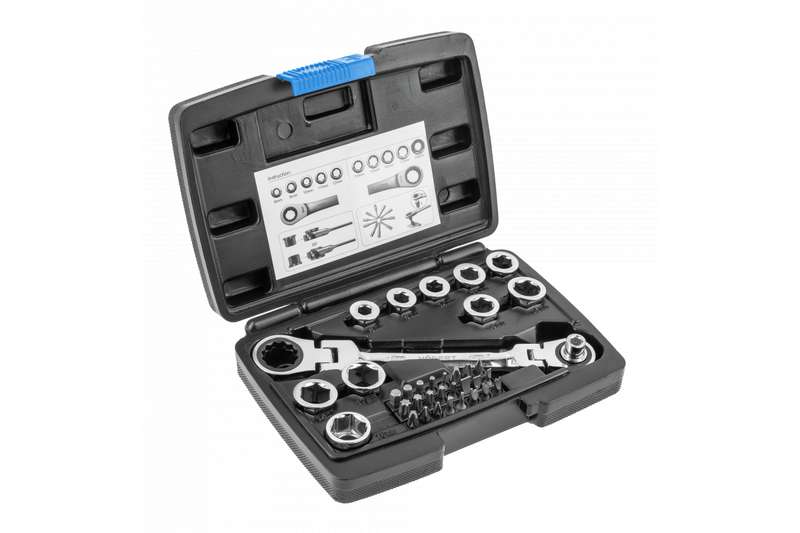 Для відкручування і затягування різьбових з'єднань з шестигранним фіксуючим елементом ідеально підходить тріскачка з шарніром і набором спеціальних головок. Завдяки тріскачці немає необхідності знімати гайковий ключ з гайки, щоб зробити ще один поворот, а гнізда дозволяють працювати з гвинтами різного розміру. Набір із 36 предметів дає можливість отримати повний набір гайкових ключів розміром 8 – 19 мм. Крім того, він включає 24 насадки для викрутки разом з адаптером. Універсальне застосування гайкового ключа дозволяє використовувати його як в майстерні, так і в ремонтних, будівельно-монтажних роботах.