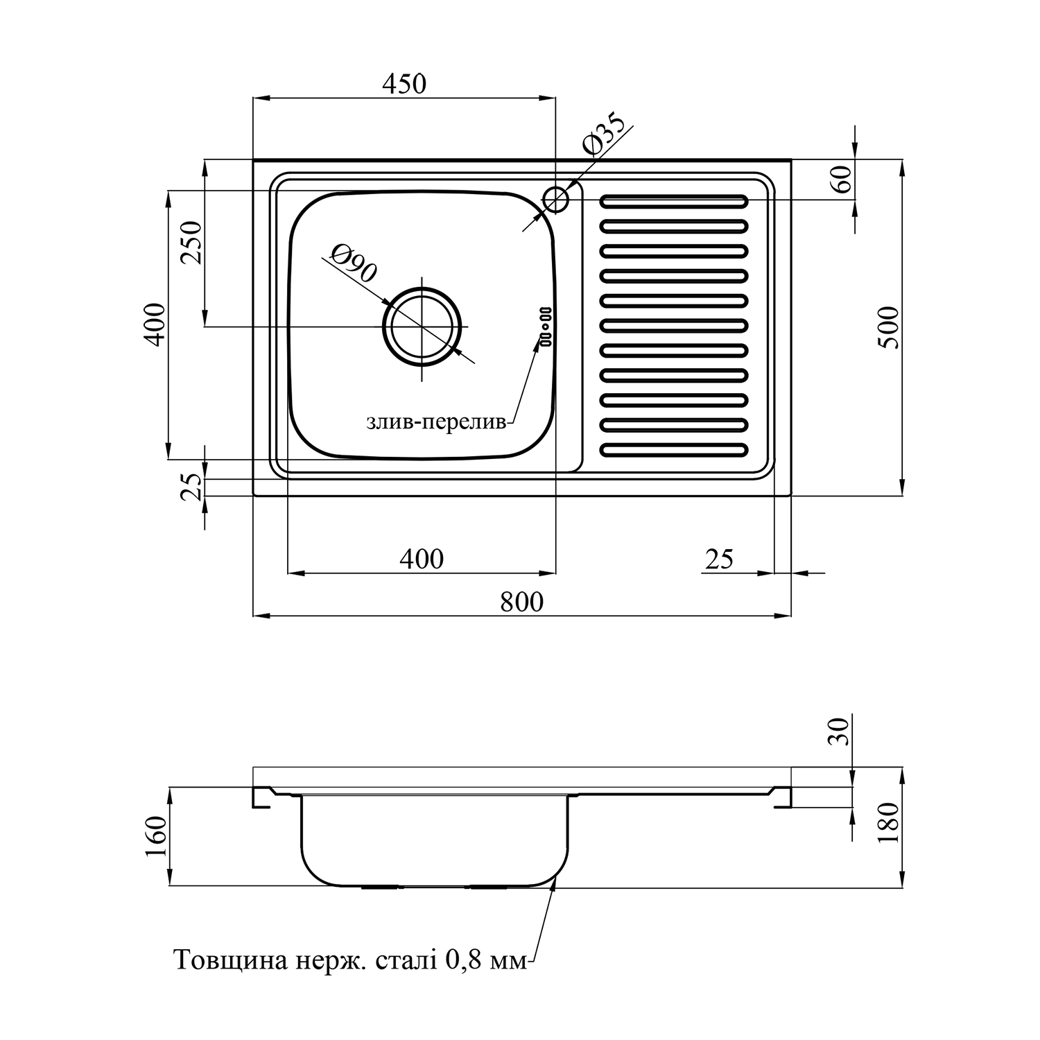 Характеристики Накладна кухонна мийка Kroner KRP Satin - 5080L (0,8 мм) код товару CV022820