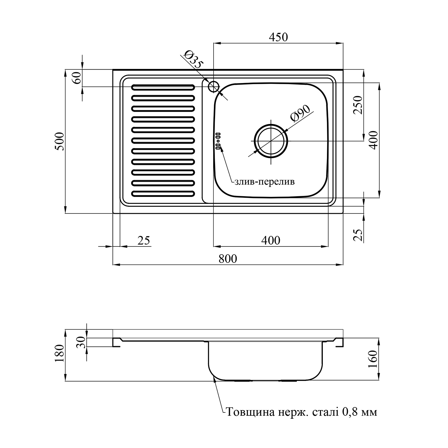 Характеристики Накладна кухонна мийка Kroner KRP Satin - 5080R (0,8 мм) код товару CV022821