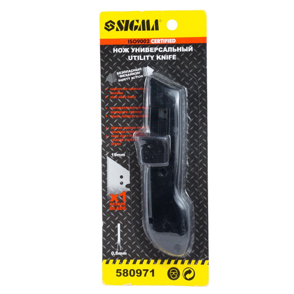 Характеристики Ніж будівельний (металевий корпус) лезо трапеція автоповернення лезвія SIGMA (8212061) код товару 1595