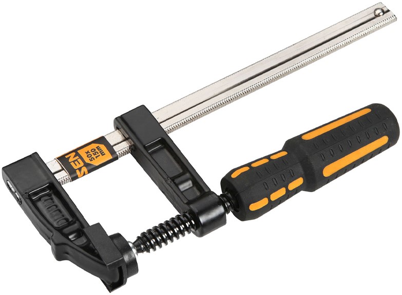 - Двокомпонентне руків’я, фігурна нікельована сталева рейка, губки з порошковим покриттям, фосфатований сталевий затискний стрижень, сила затиску