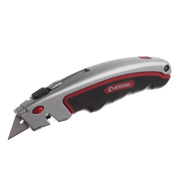 Опис Ніж трапецієвидний 60*19мм з висувним лезом, металевий корпус, прорезинена рукоятка INTERTOOL HT-0516 код товару HT-0516