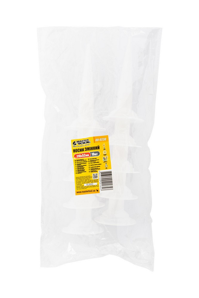Змінний носик MASTERTOOL призначений для пістолетів 80-0236/80-0237. У наборі 10 штук, що забезпечує довготривале використання та зручність в роботі. Ідеальний для різних застосувань.