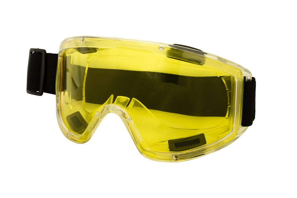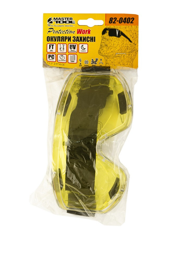 Опис Очки-полумаска закриті MASTERTOOL ANTI-SCRATCH 4 вентиляційних клапана регульований ремінь l клас жовті код товару 82-0402