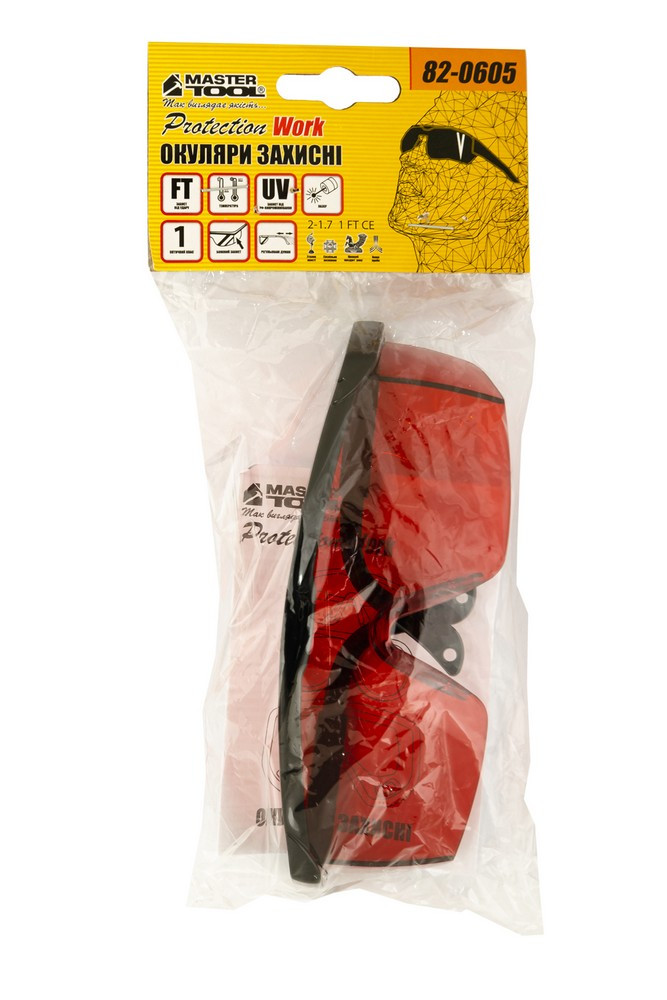 Очки захисні. Модель: MASTERTOOL КОМФОРТ. Тип: відкриті. Дужки: регульовані. Колір: червоний. Артикул: 82-0605. Призначення: захист очей. Виробництво: Україна. Матеріал: пластик. Стандарт: EN 166. Особливості: легкість, комфорт, можливість регулювання. Використання: будівництво, промисловість. Підходять для: чоловіків та жінок. Розмір: універсальний. Вага: легкі. Додаткові елементи: антифог покриття. Термін служби: залежить від умов експлуатації. Упаковка: індивідуальна.