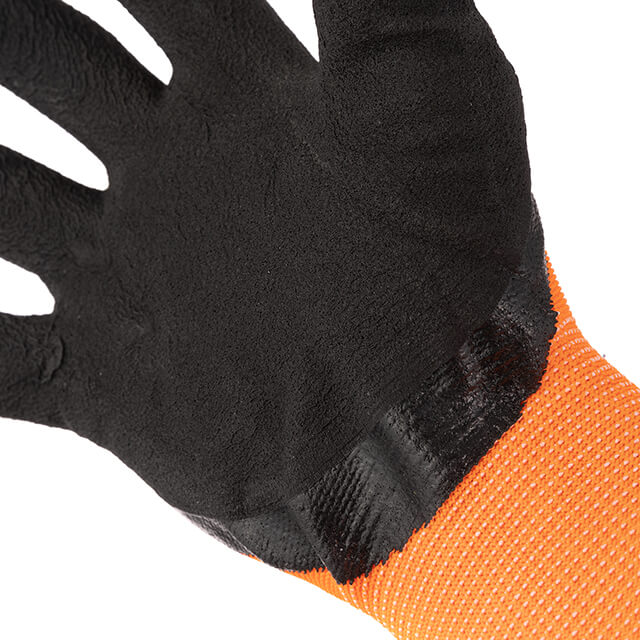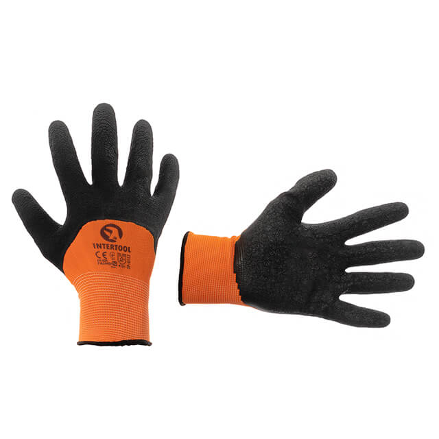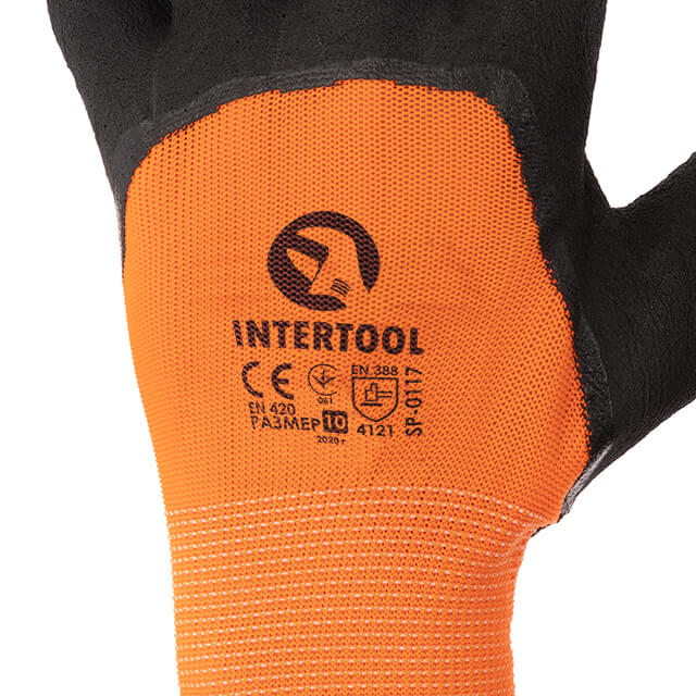 Опис Перчатка трикотажная, синтетическая, усиленная, 3/4 облив, покрытая черным вспененым латексом, 10" INTERTOOL SP-0117 код товару SP-0117