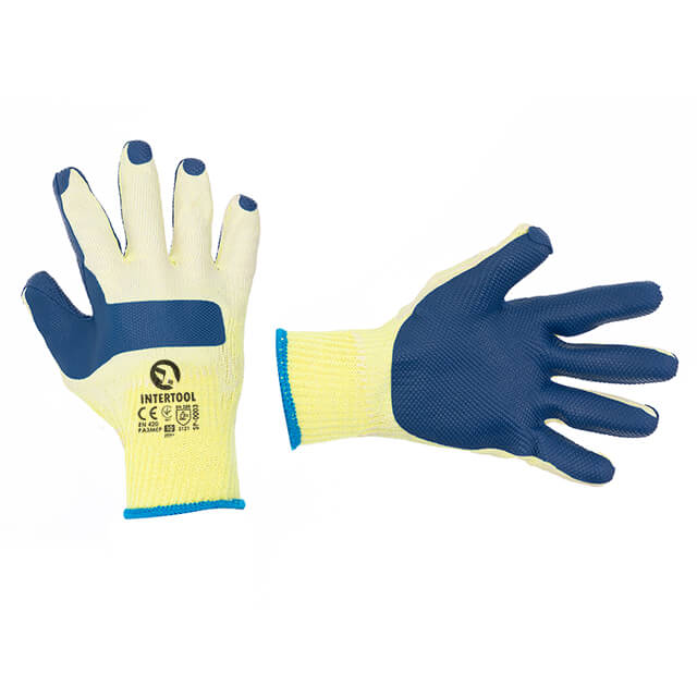 Опис Перчатка трикотажная, поликоттон, стекольщика (каменщика), с двойным латексным покрытием синего цвета на ладони, с защитой суставов, 10" INTERTOOL SP-0003 код товару SP-0003
