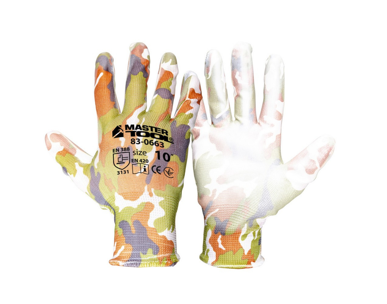 Характеристики Перчатки безшовні трикотажні MASTERTOOL Хакі з поліуретановим покриттям долоні 10 17-20 г підвіс 12 пар код товару 83-0663doz