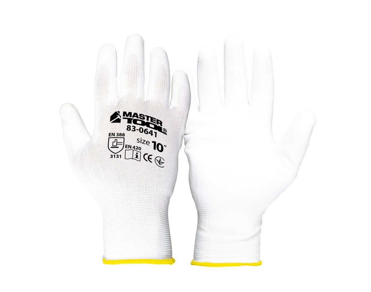 Перчатки трикотажні MASTERTOOL поліуретанові, 10, білі (артикул 83-0641) - зручні та міцні рукавички для роботи, забезпечують надійний захист та відмінну тактильність. Ідеальні для різних завдань.