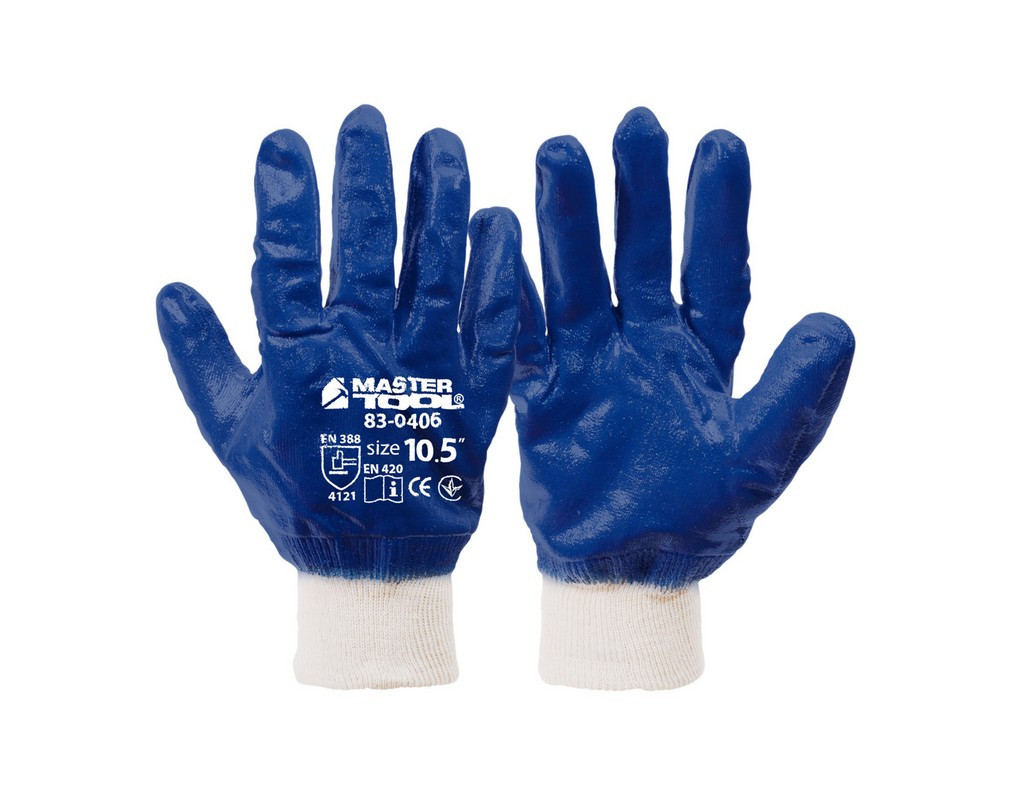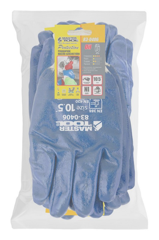 Опис Перчатки масло-бензостойкие MASTERTOOL полное нитриловое покрытие вязаный манжет 10.5" 12 пар синие 83-0406doz код товару 83-0406doz