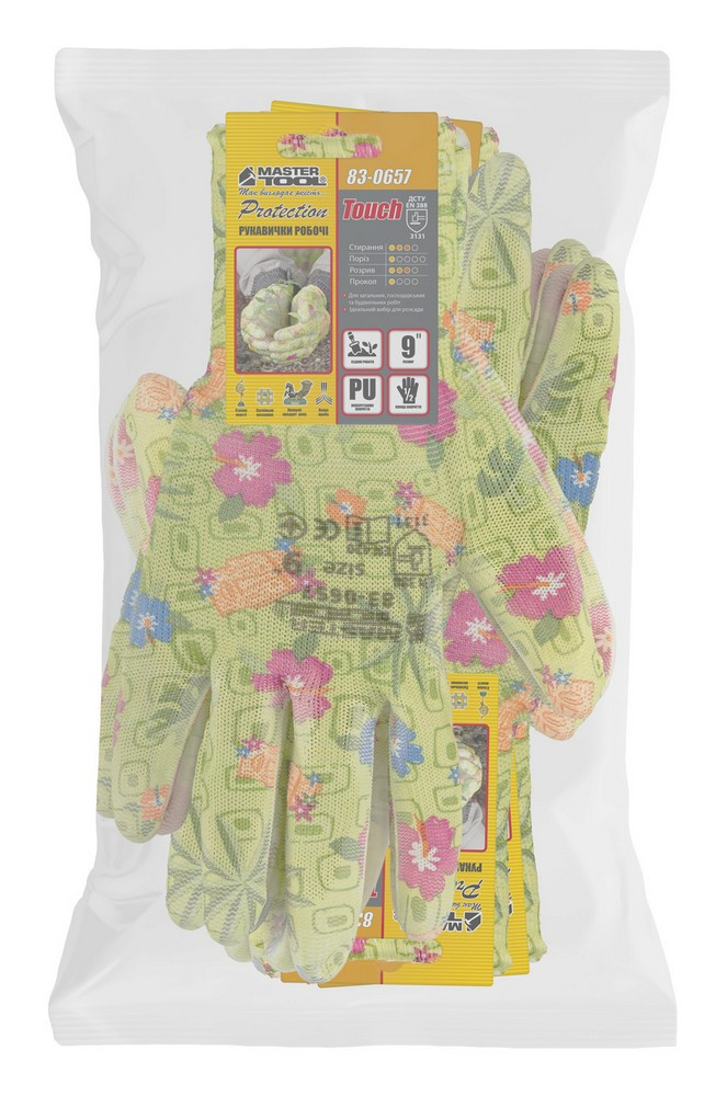 Характеристики Перчатки трикотажні безшовні MASTERTOOL Хризантема з поліуретановим покриттям долоні 9 17-20 г підвіс 12 код товару 83-0657doz