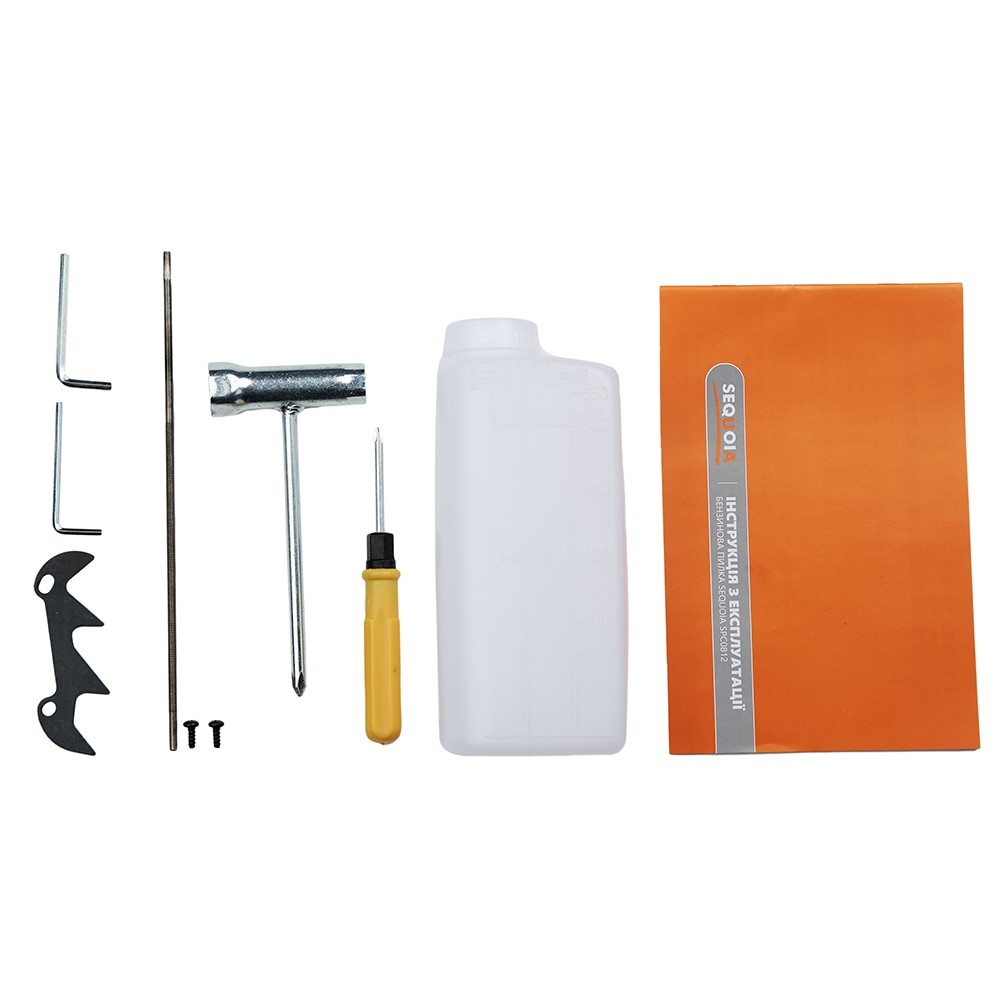 - Цепь. Шина. Кожух шины. Емкость для приготовления топливной смеси. Зубчастый упор с комплетом крепежа. Набор ключей. Инструкция по эксплуатации