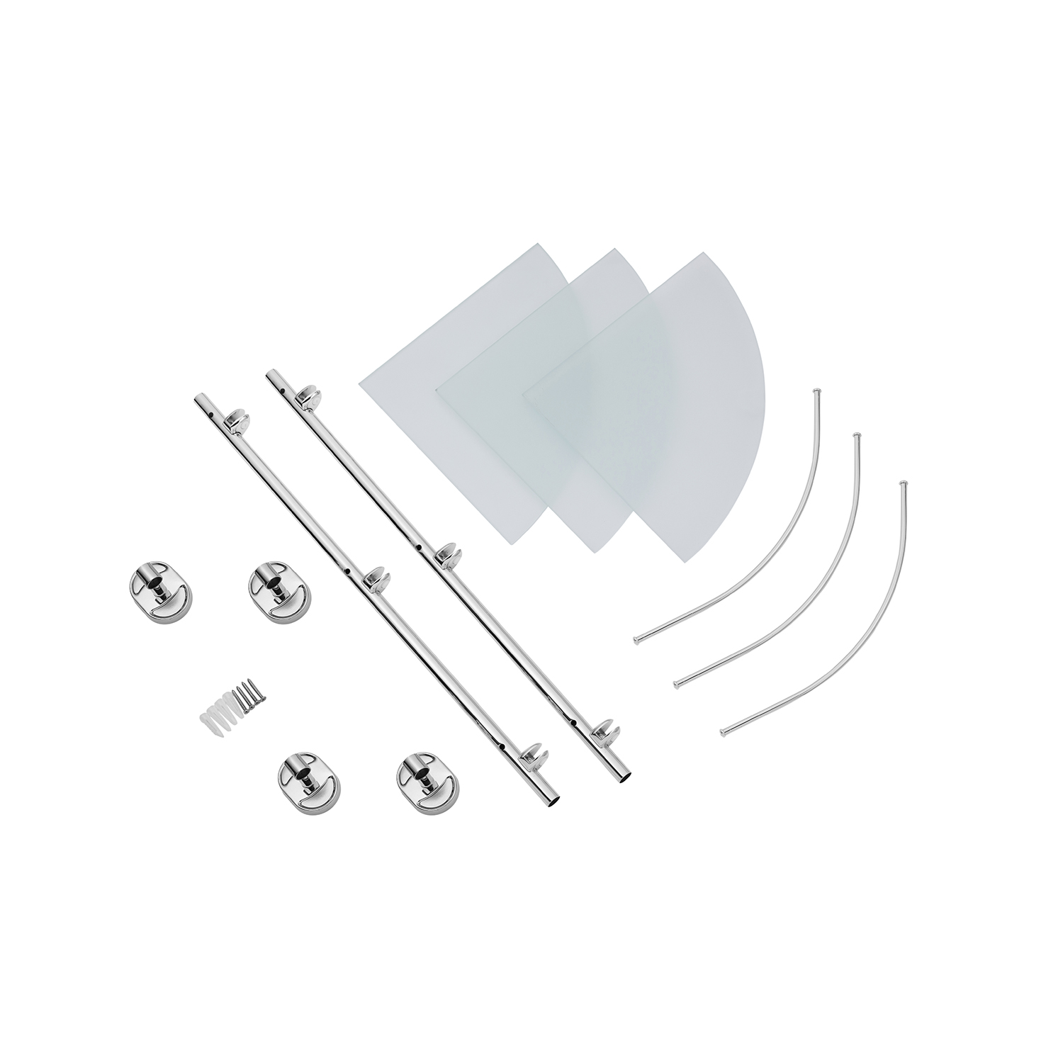 Полиці – 3 шт., тримачі – 4 шт., борти полиць – 3 шт., кріплення.