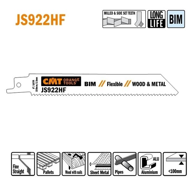 Опис Полотно пильне для сабельної пилки 150 x 130 x 19 мм, K 0,90; TS 2,5 CMT (JS922HF-5) код товару JS922HF-5