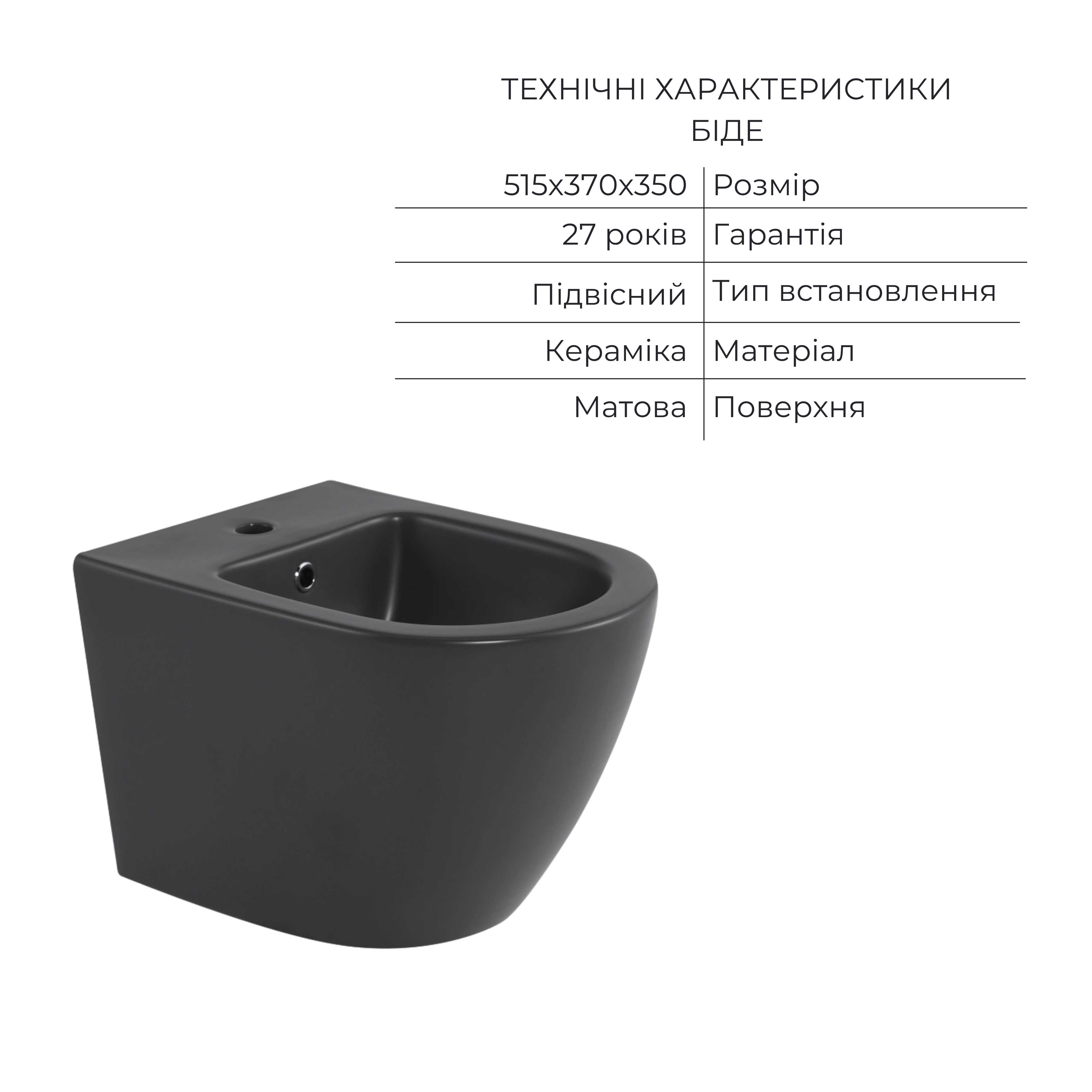 Характеристики Qtap Комплект Robin Anthracite 3 в 1: унитаз подвесной Ultra Quiet + биде подвесное + раковина накладная QTROBAN49157 код товару SD00055281