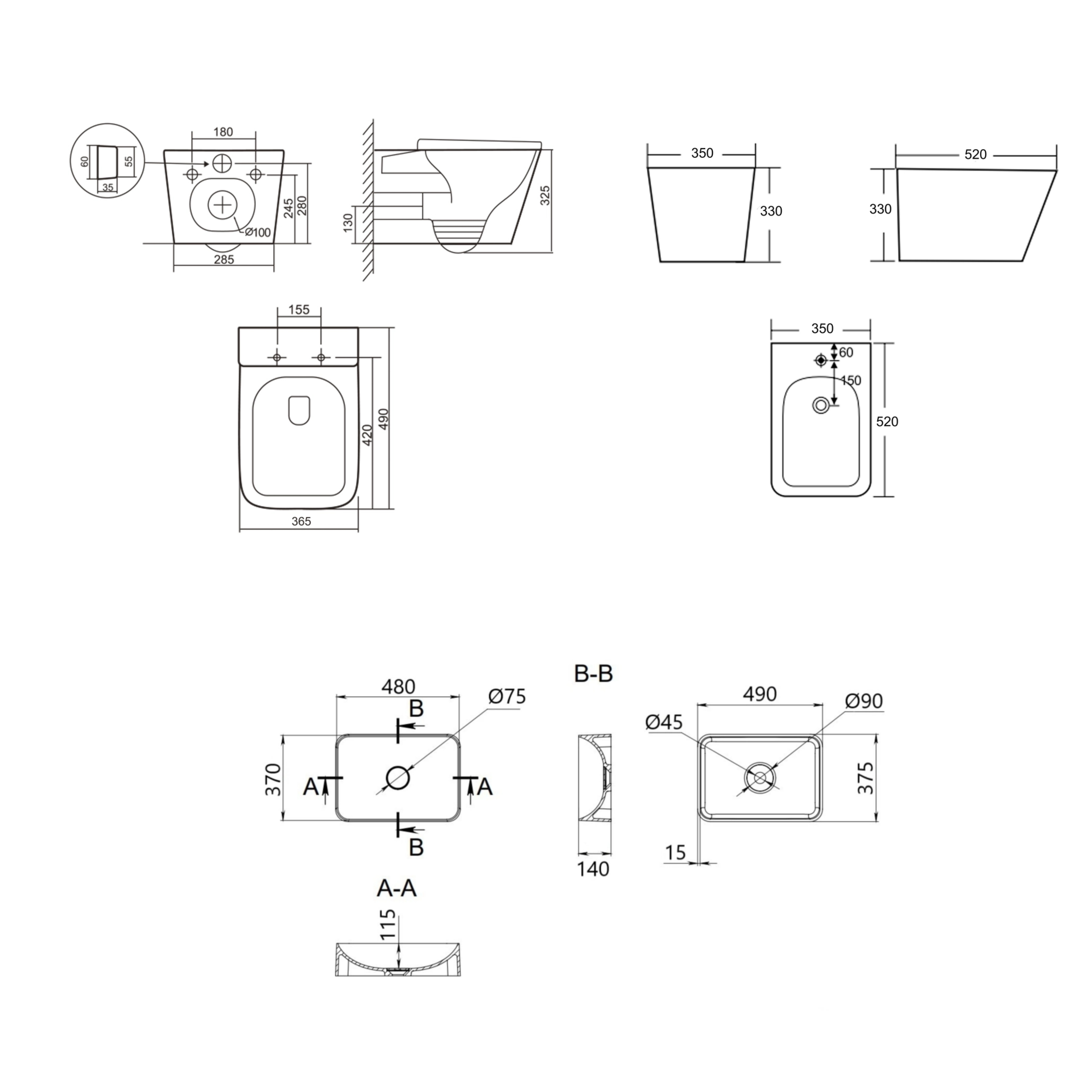 Унитаз (QT17332303ASSG), биде (QT17551303GSG), раковина (QT17116069SG)