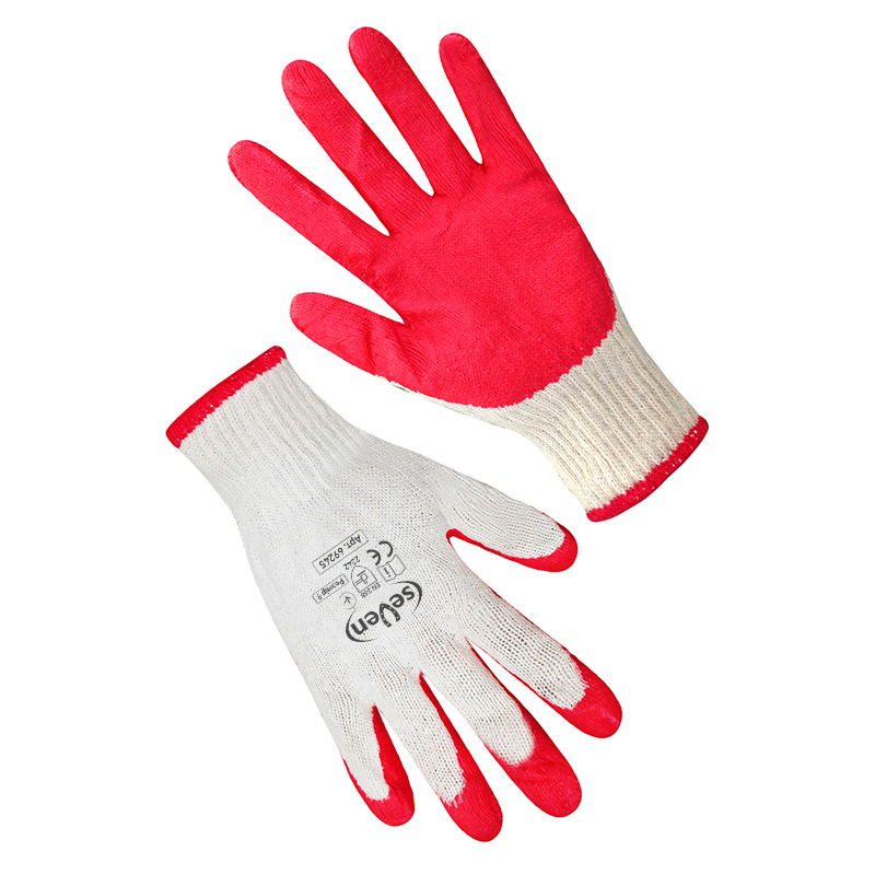 Матеріал: - основа: бавовна; - покриття: латекс; Особливості: - колір основи: білий; - покриття: червоний; - розмір: 10; - вага пари: 40 г Кількість в упаковці 10 пар Вага упаковки 0,400 кг Групова упаковка - тюк Кількість пар у груповій упаковці - 600 пар.