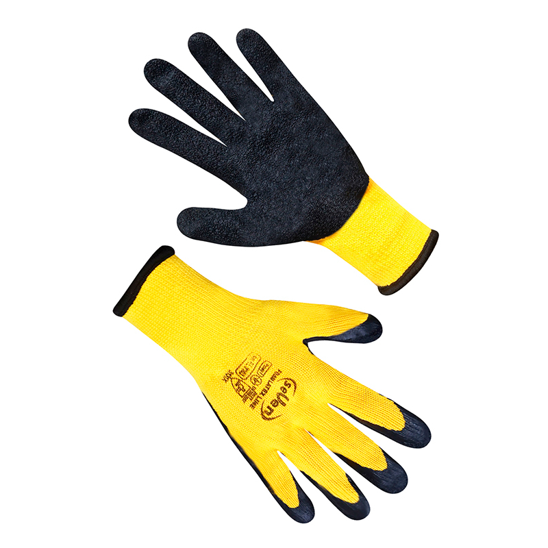 Матеріал: - основа: бавовна; - покриття: спінений латекс, не повне; Особливості: - колір основи: жовтий; - Покриття: чорне; - Розмір: 9; - вага пари: 90 г. Кількість в упаковці 12 пар Вага упаковки 1,080 кг. Групова упаковка - мішок Кількість пар у груповій упаковці – 480 пар.