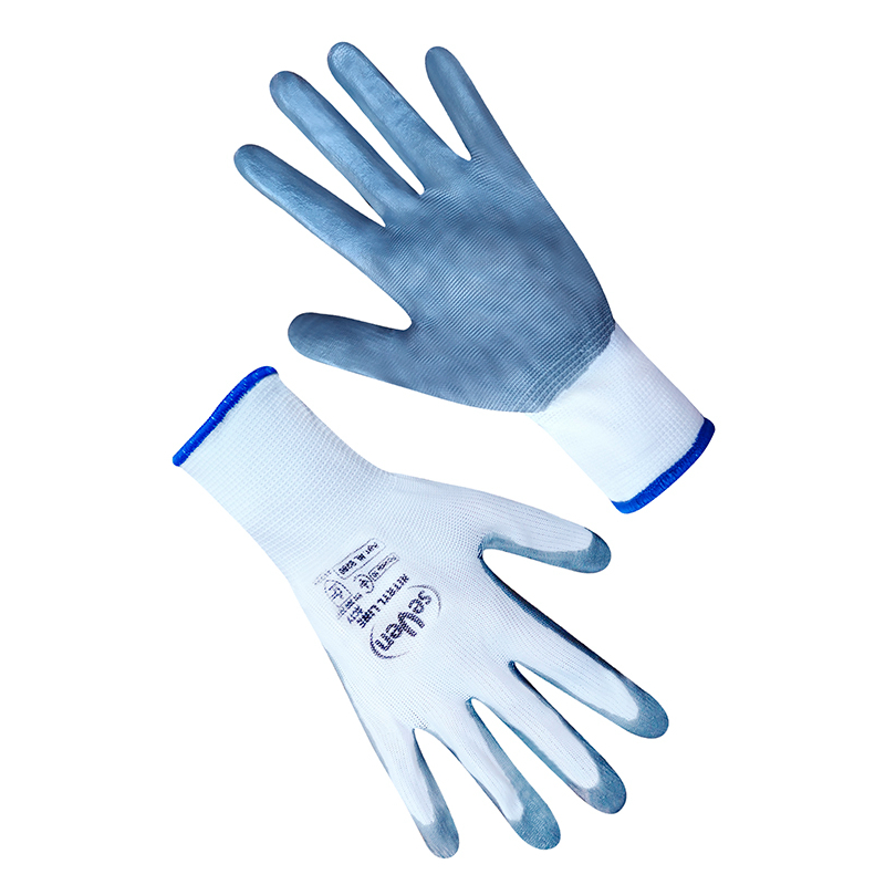 Захисні рукавички виготовлені із нейлону, покриті нітрилом. Дана модель рукавичок характеризується стійкістю до протирання та проколів, підходять для складних робіт. Мають високу еластичність, при роботі не сковують рухи мають підвищену тактильну чутливість. Нітрилове покриття збільшує стійкість виробу до масел і рідин.