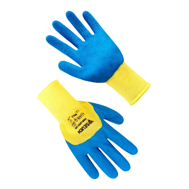 Особливості: - колір основи: жовтий; - покриття: синій; - розмір: 10; - вага пари: 68 г. Кількість в упаковці 12 пар Вага упаковки 0,816 кг. Групова упаковка - картонний ящик Кількість пар в груповій упаковці - 240 пар.