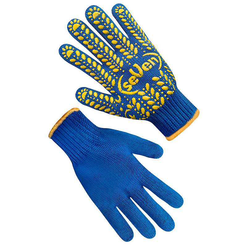 Сині рукавички для захисту рук під час роботи та виконання складних видів робіт. Виготовлені з нитки в п'ять складань. Склад: бавовна - міцний натуральний матеріал, що забезпечує комфорт у використанні. Манжет - «резинка».Синтетичні волокна роблять трикотажне полотно більш еластичним та стійким до пошкоджень. Таку модель часто купують в господарських магазинах і замовляють на виробництва.