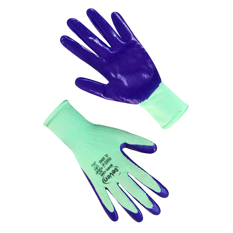Салатові жіночі рукавички із синім нітриловим покриттям призначені для захисту шкіри рук під час виконання дрібних робіт. Тонкий матеріал основи гарно облягає руку, забезпечуючи комфортне носіння та максимальну чутливість кінчиків пальців. Рукавичка має манжет у вигляді резинки та оброблений швом оверлок край, який захищає виріб від розтягування. Тильна сторона рукавички не має покриття, забезпечуючи вільну циркуляцію повітря всередині рукавички. Модель комфортна для носіння навіть протягом тривалого проміжку часу.