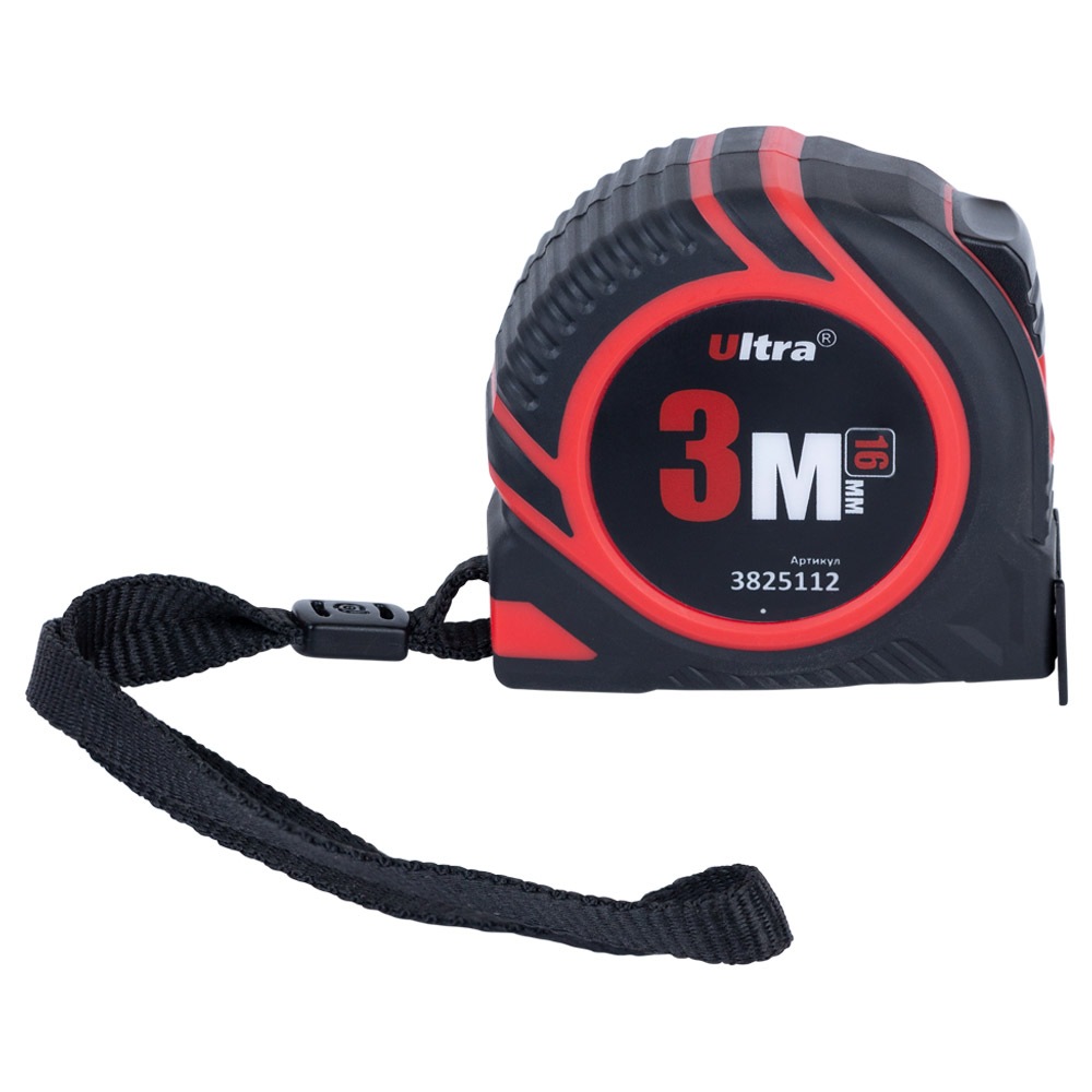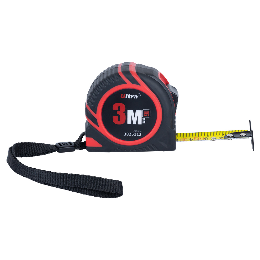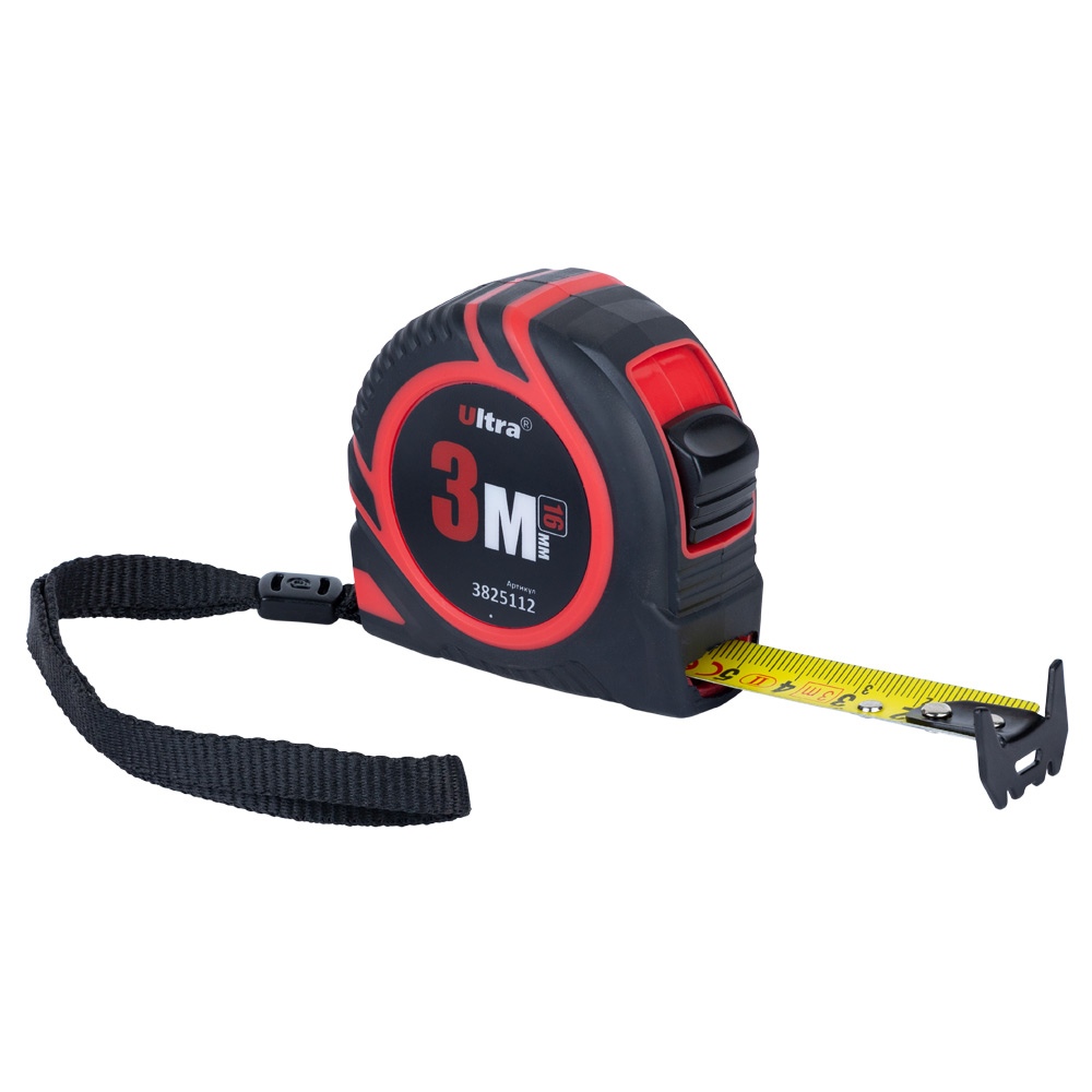 Рулетка обрезинена ULTRA, довжина 3м, ширина стрічки 16мм. Має нейлонове покриття для підвищеної міцності та зносостійкості. Ідеальна для точних вимірювань у побуті та на будівництві.