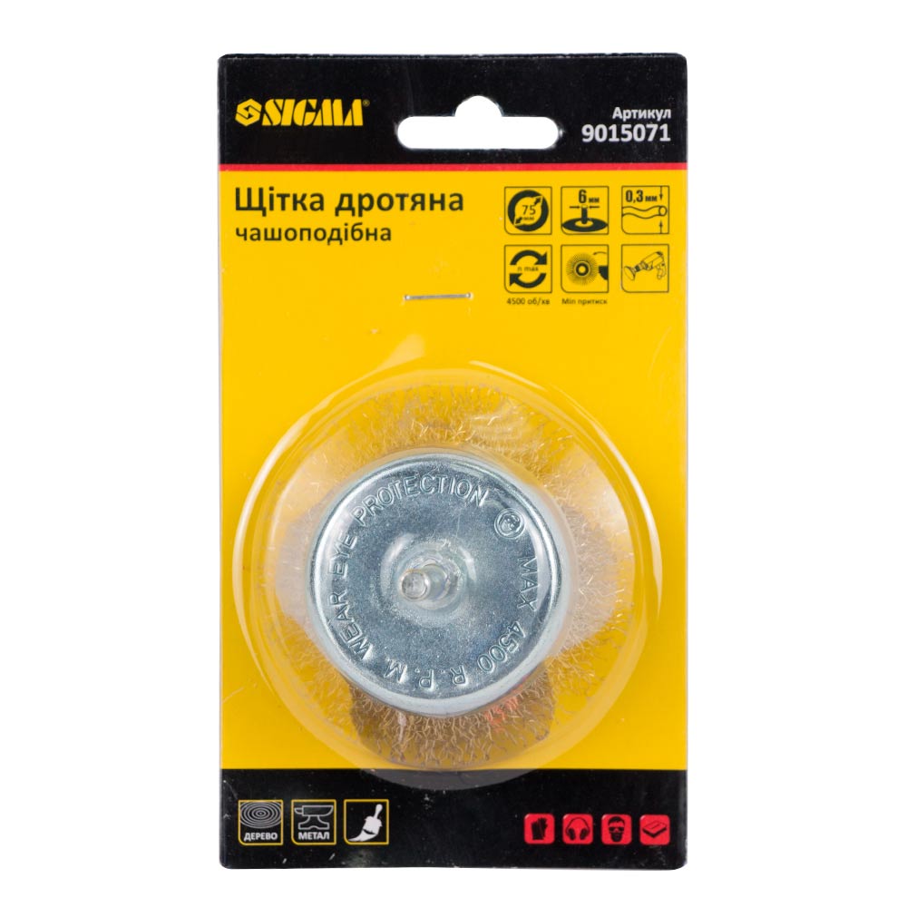 Характеристики Щітка проволочная чашеобразна 75мм хвостовик 6мм (латунирована) SIGMA (9015071) код товару 9015071