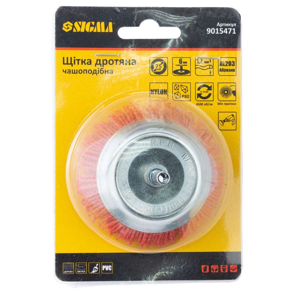 Характеристики Щітка проволочна чашеобразна 75мм хвостовик 6мм (нейлонова) SIGMA (9015471) код товару 9015471