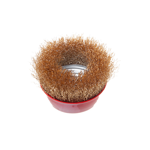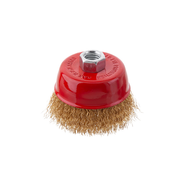 Характеристики Щітка чашкова, 75 мм, M14, кручений дріт покритий латунню, для КШМ, 12500 об/хв код товару BT-1076