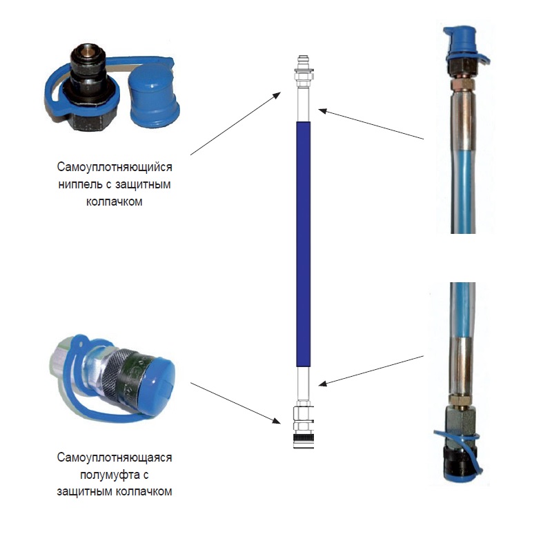 Шланг високого тиску, з робочим тиском 1500 bar виготовлений з кількох армованих шарів, кодовий колір СИНІЙ.Шланги поставляються повністю зібраними з самоуплотняющимися швидкороз'ємними муфтами для швидкої і безпечної роботи.Муфти оснащені синіми пластиковими захисними ковпачками.Шланги зібрані, заповнені маслом і випробувані високим тиском перед відправкою. До кожної партії додаються сертифікати випробувань.Всі шланги мають серійні номери для ідентифікації. Шланги мають додатковий прозорий шар з ПВХ для максимального захисту відмеханічних і хімічних впливів.Мінімальний тиск розриву становить 4500 bar, а мінімальний радіус вигину 150мм.Всі шланги високого тиску відповідають вимогам директиви Європейського союзу по устаткуванню і мають маркування СЕ.