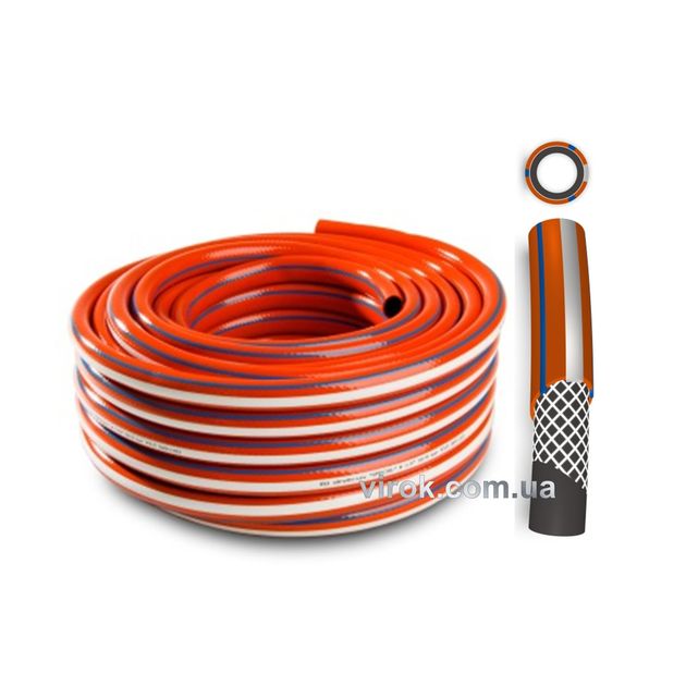 Характеристики Шланг ПХВ водяний "SPECIAL" оранжевий, з робочим тиском 0,8 МПа, 3/4", товщина 2,4 мм, довжина 20 м. код товару 79V324