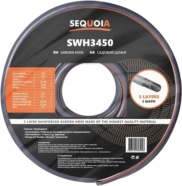 Шланг SEQUOIA SWH3450 - надійний та гнучкий шланг для поливу, виготовлений з якісних матеріалів. Стійкий до механічних пошкоджень і ультрафіолету, ідеальний для садівників і городників.