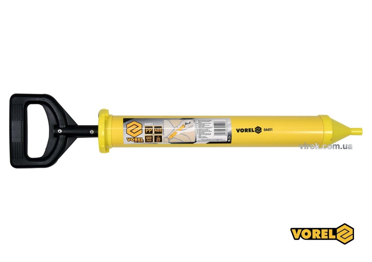 Шприц для нанесення будівельних сумішей VOREL має пластиковий корпус Ø=60 мм, сопло Ø=10 мм та довжину 660 мм. Ідеальний для точного нанесення матеріалів.