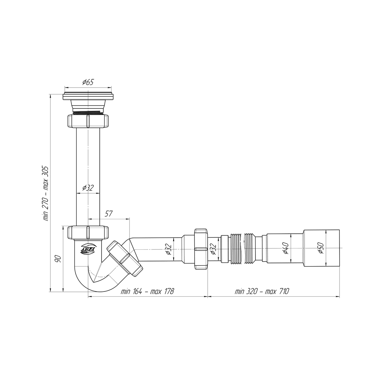 Сифон прямоточний, нержавіюча сітка, гофротруба.