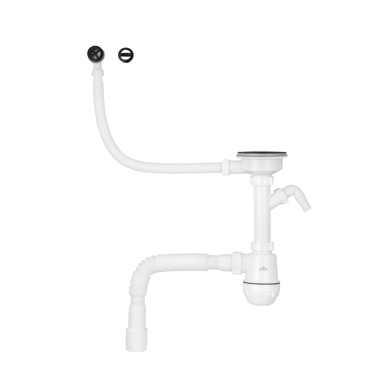 Характеристики Сифон для кухонной мойки Kroner KRP KS02R-1BLK 3 1/2"х40/50 мм с отводом для стиральной машины, с круглым переливом код товару CV034317