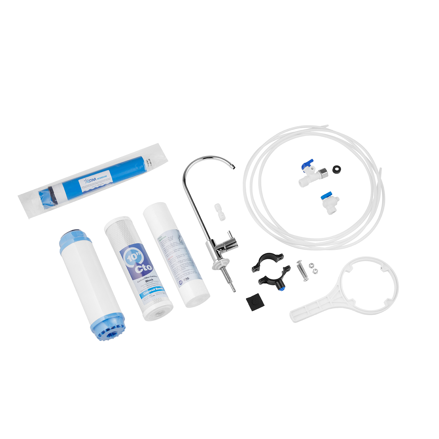 - Фильтр сбора, 5 картриджей, накопительный бак, одинарный кран, комплект для подключения и инструкция.