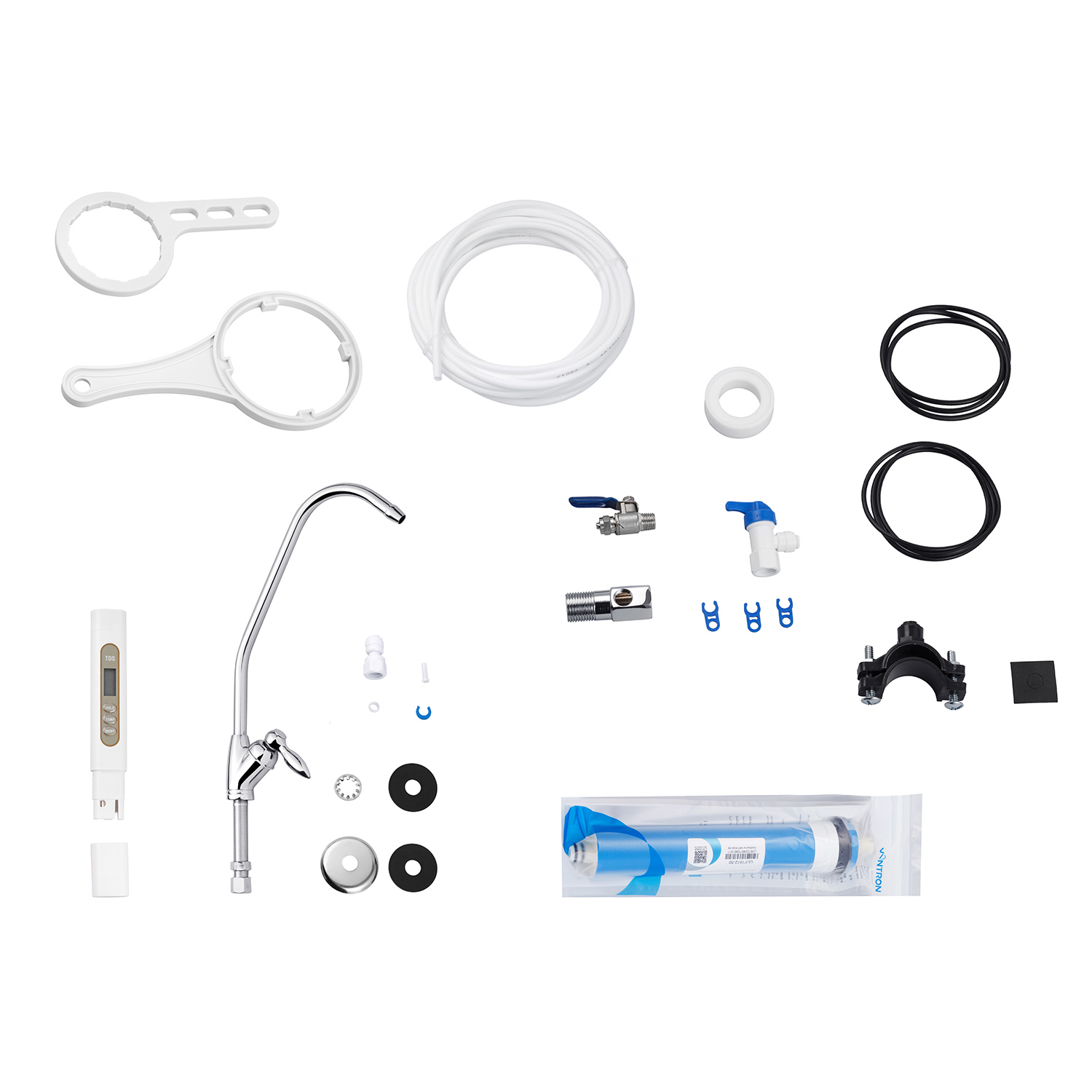 - Фильтр сбора, 5 картриджей, накопительный бак, одинарный кран, комплект для подключения и инструкция.