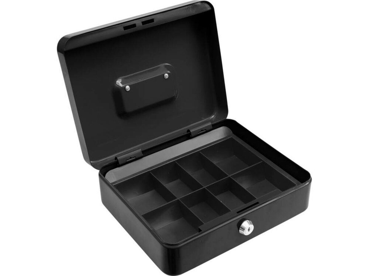 Скринька для грошей VOREL чорного кольору з замком (2 ключі) має розміри 250x200x90 мм. Ідеальна для зберігання грошей та цінностей, забезпечує надійний захист.