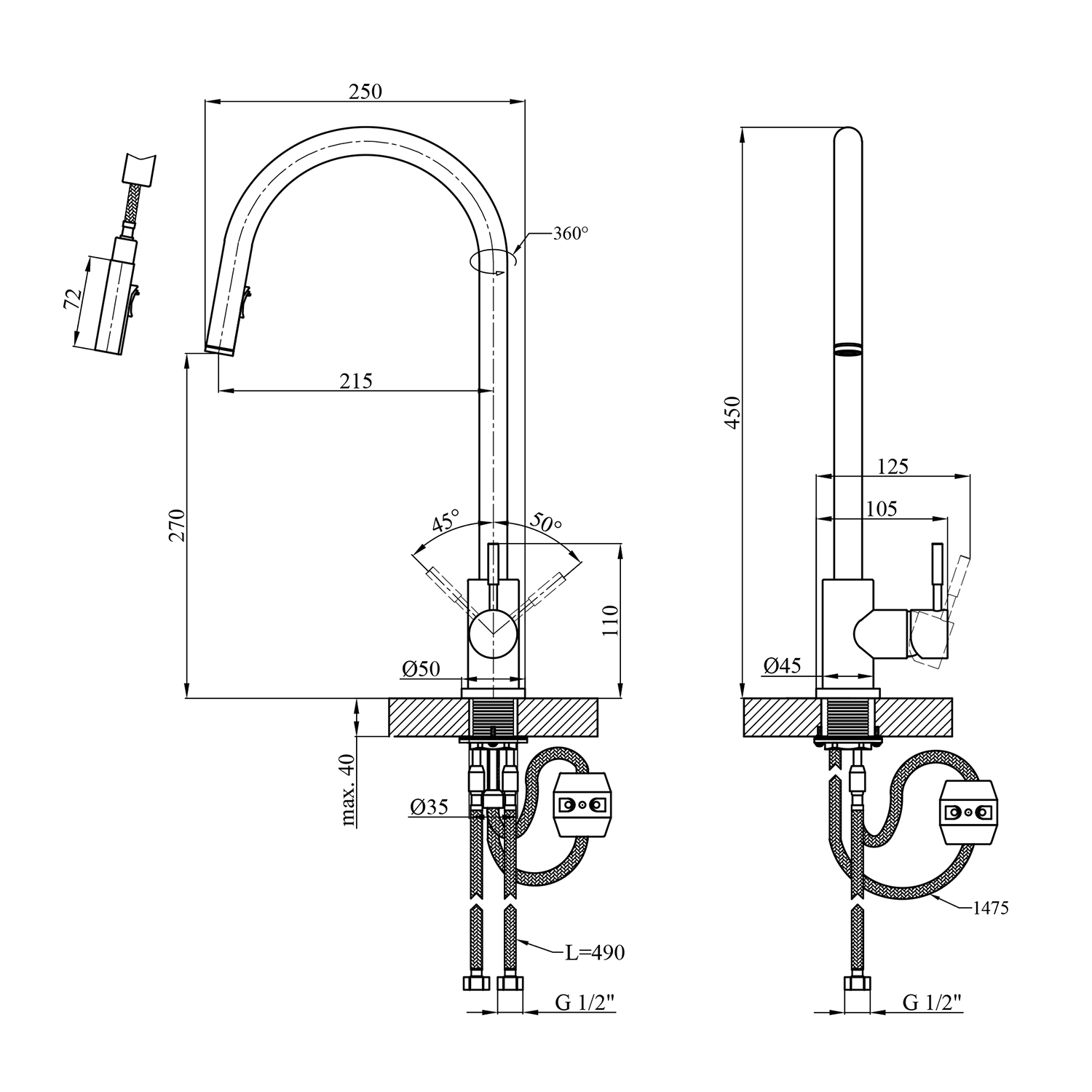 Характеристики Змішувач для кухні з висувним виливом KRP Edelstahl Klassisch - SCH03915 код товару CV032282