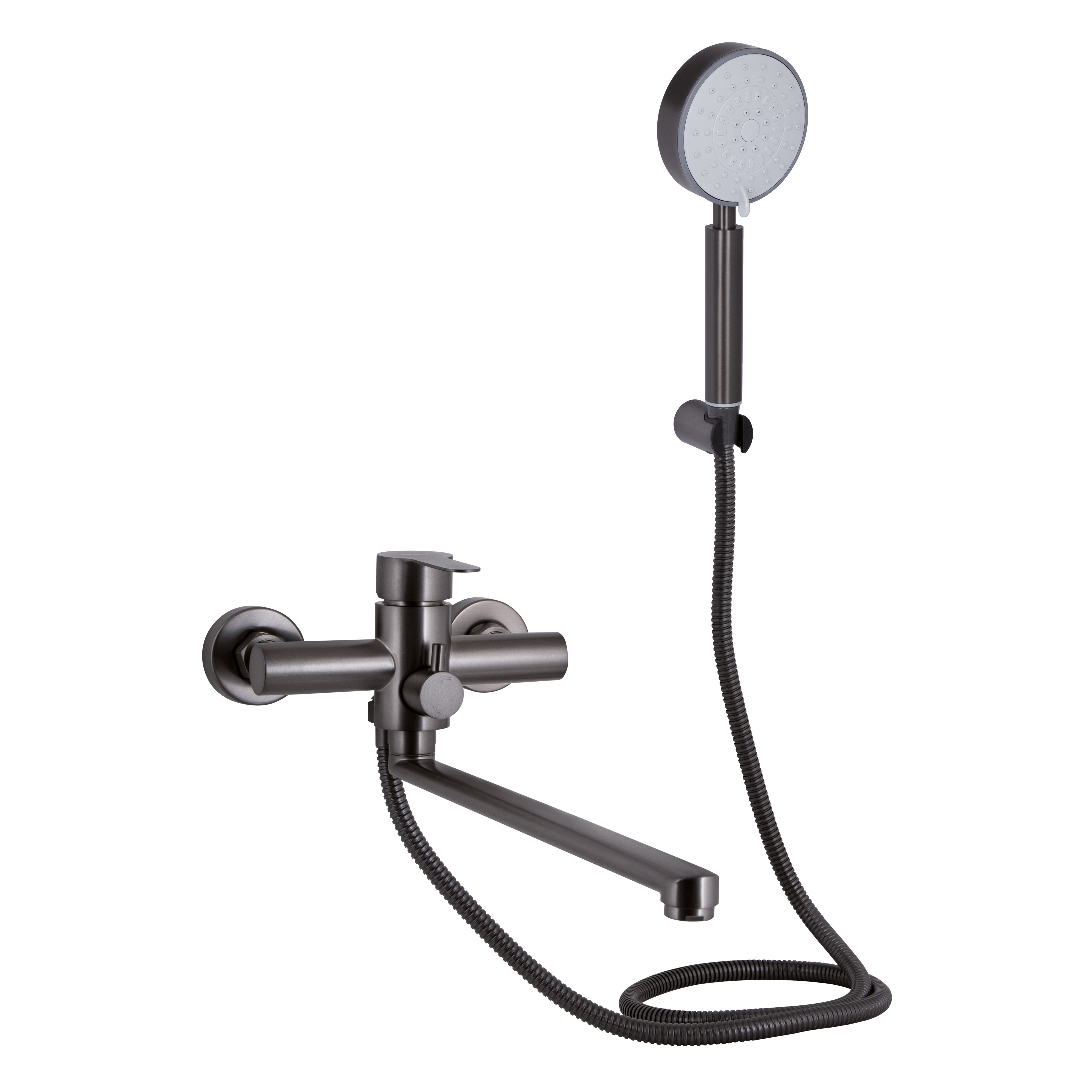 Змішувач для ванни Brinex Pure 005 з довгим поворотним виливом і душовим гарнітуром у кольорі графіт. Стильний та функціональний, ідеальний для сучасної ванної кімнати.
