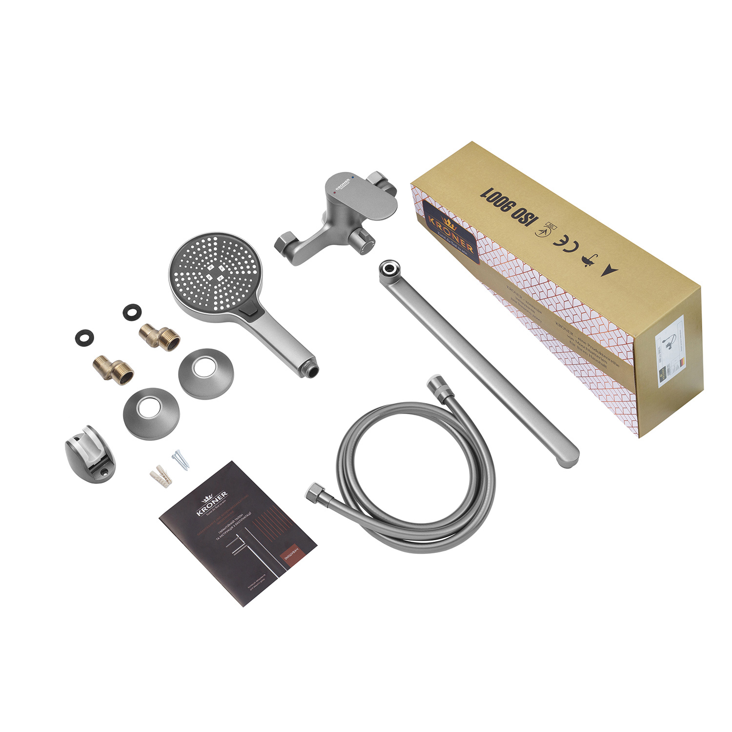 Смеситель, лейка для ручного душа, душевой шланг, кронштейн для ручного душа, крепежи, дополнительный аэратор, инструкция.
