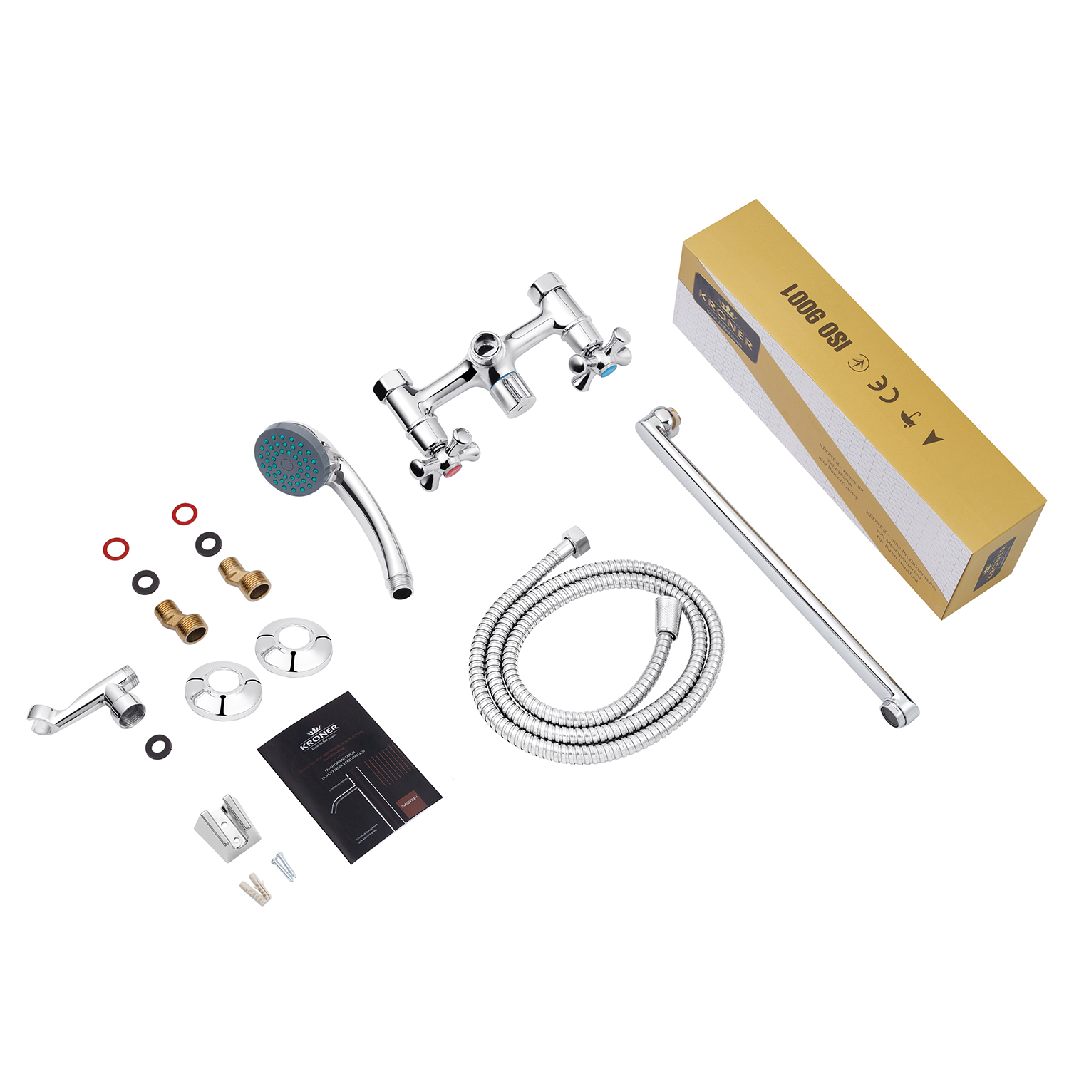 Змішувач, лійка для ручного душу, душовий шланг, кронштейн для ручного душу, кріплення, інструкція.