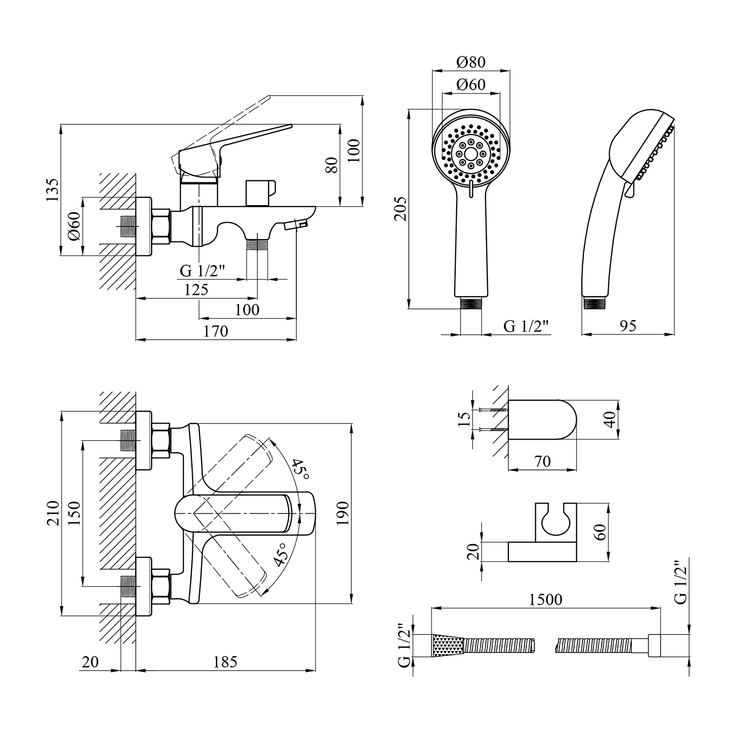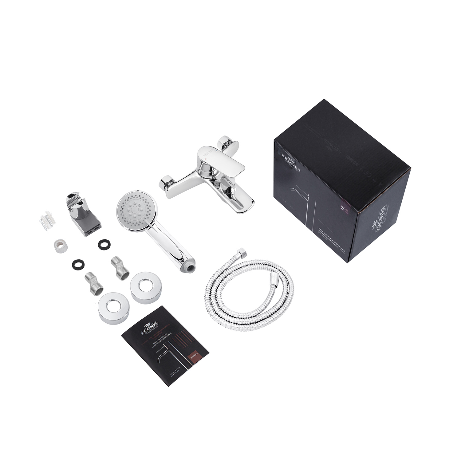 Змішувач, лійка для ручного душу, душовий шланг, кронштейн для ручного душу, кріплення, інструкція.