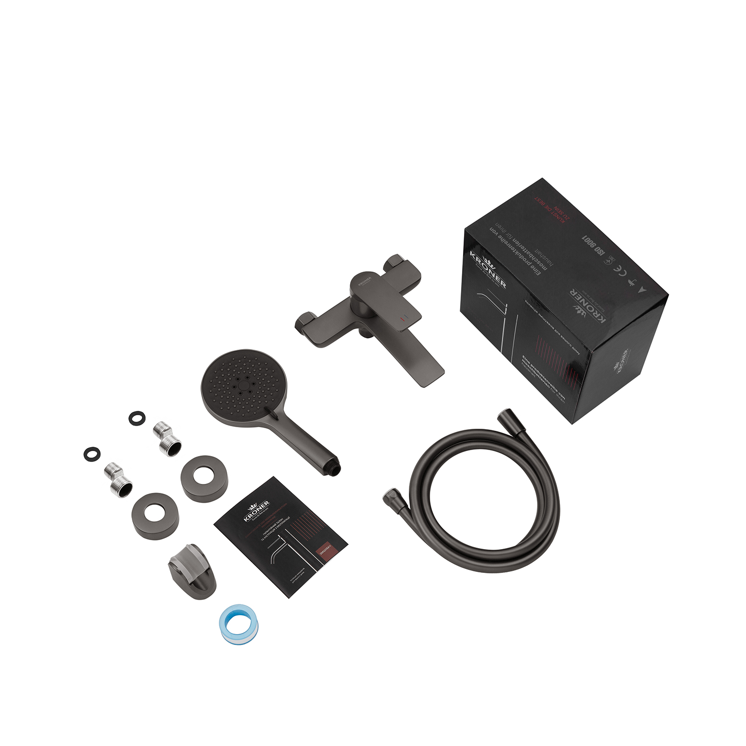 Змішувач, лійка для ручного душу, душовий шланг, кронштейн для ручного душу, кріплення, інструкція.