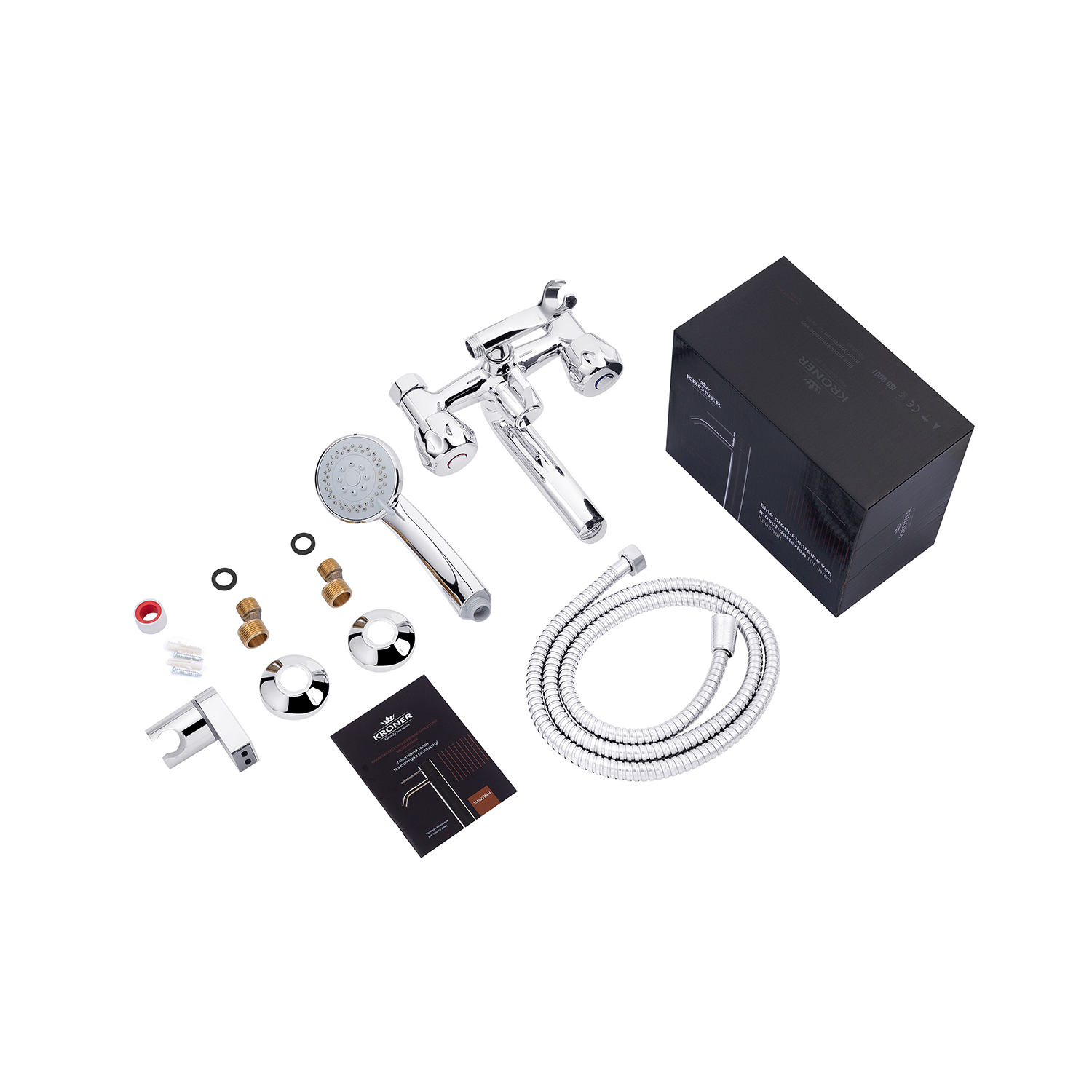 - Змішувач, лійка для ручного душу, душовий шланг, тримач для ручного душу, перехідник на душовий шланг, кріплення, інструкція.